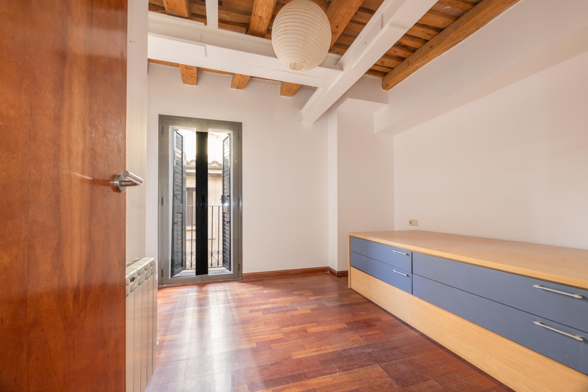 A la primera planta, la cuina-menjador es presenta com un espai obert i lluminós amb sortida a dos balcons que permeten gaudir de l’ambient del centre històric. En aquesta mateixa planta hi trobem dues habitacions exteriors, una doble amb armari encastat i una individual, i un bany amb plat de dutxa.