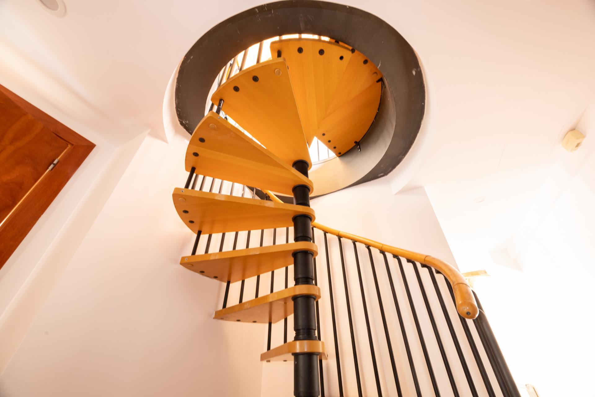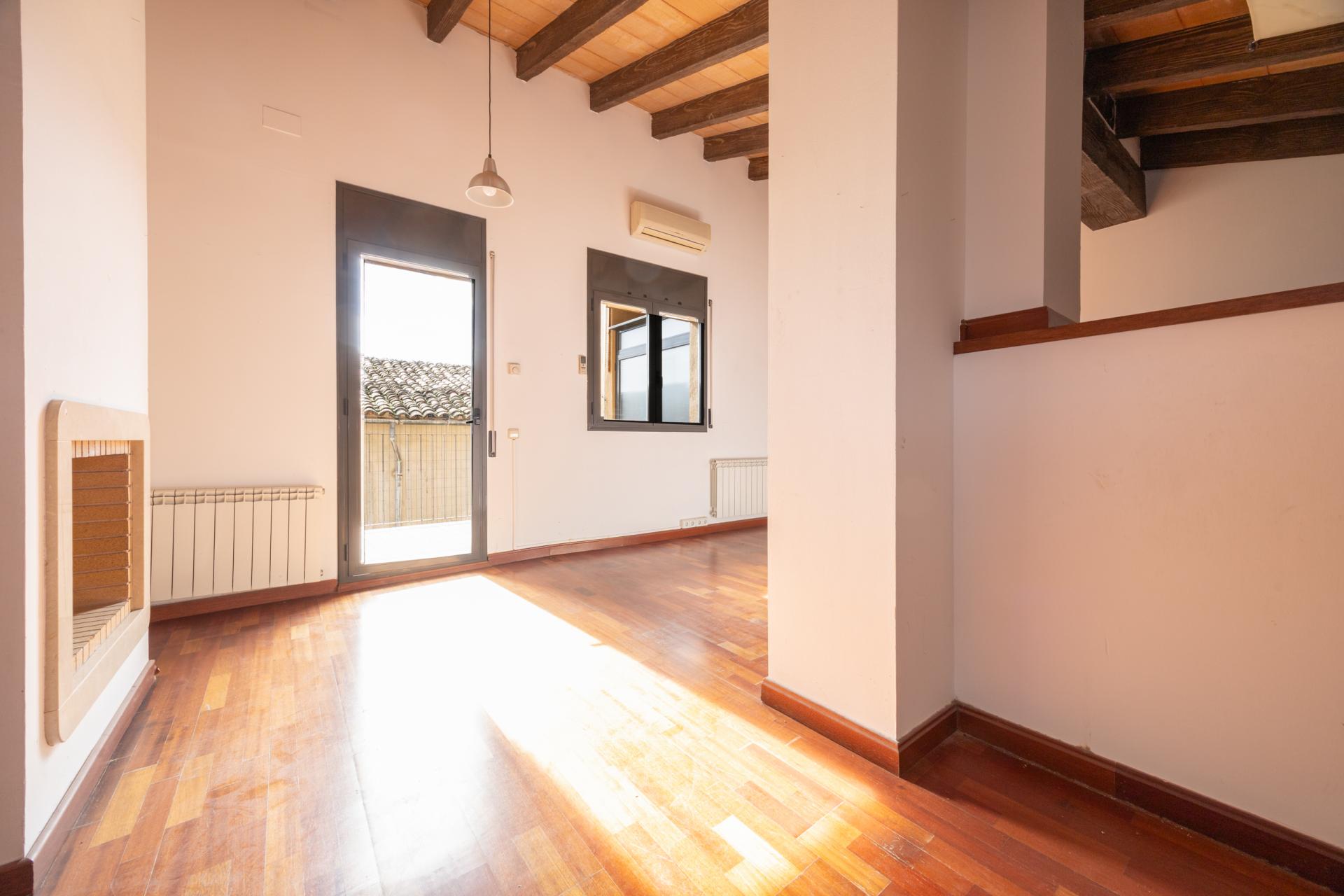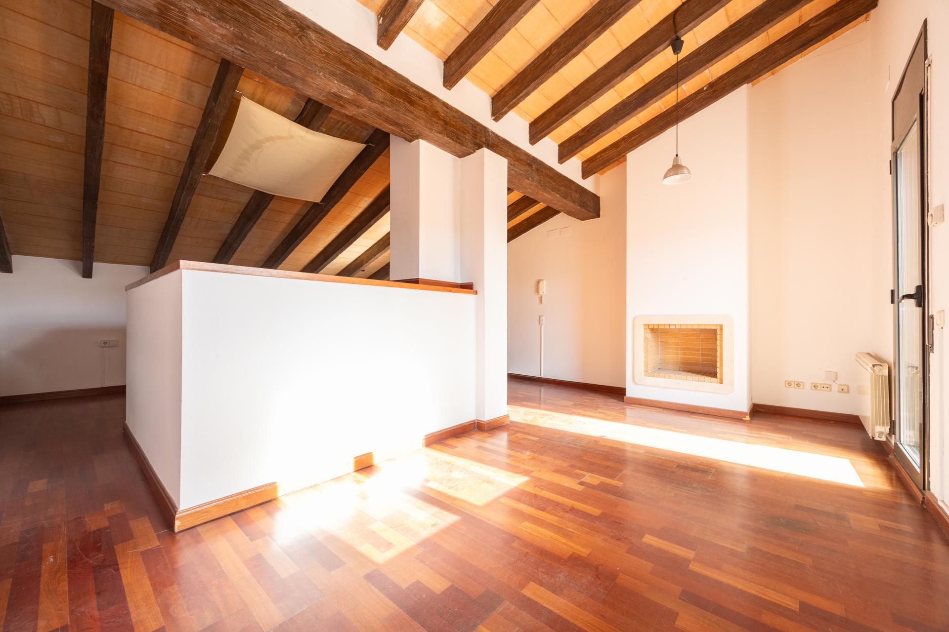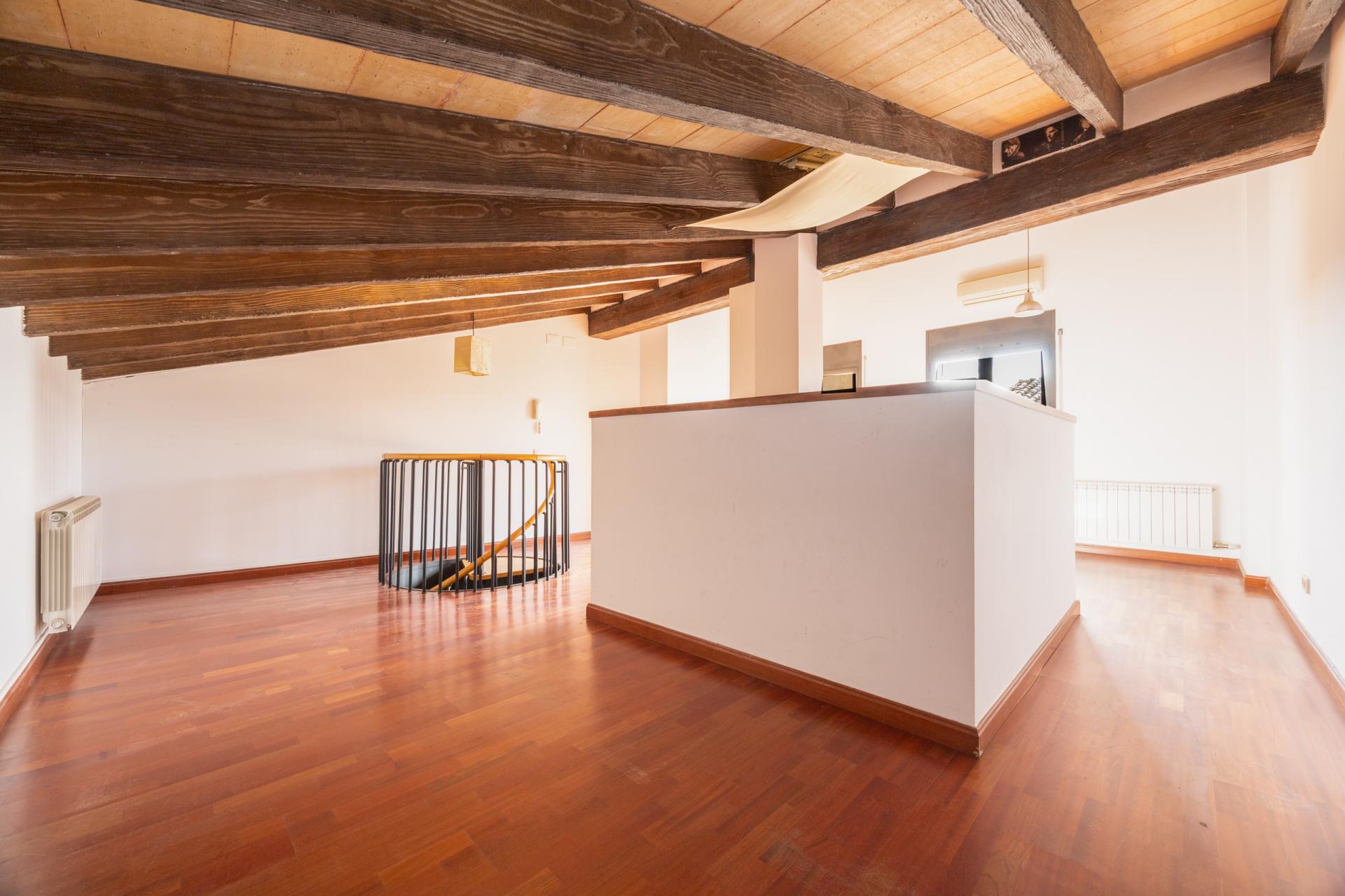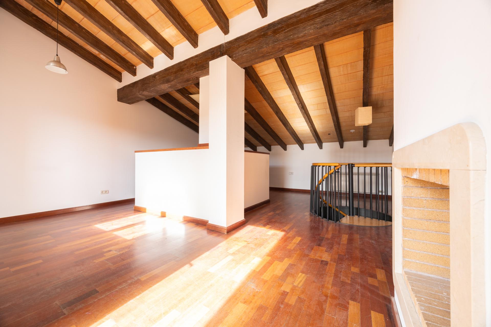 On the upper floor, accessed via a spiral staircase, there is a charming attic-style study with exposed beams that provides a cosy and unique atmosphere. The fireplace adds warmth, and the access to the terrace with views makes this space a special corner of the home.