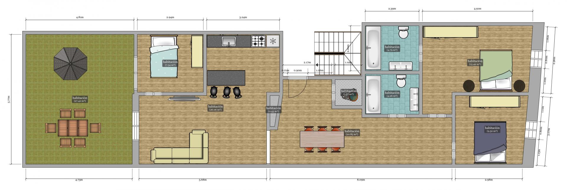 El piso cuenta con dos habitaciones dobles, una tipo suite con baño incorporado, y una habitación individual, además de un baño independiente, todos equipados con platos de ducha modernos y mamparas, perfectos para desconectar después de un largo día.