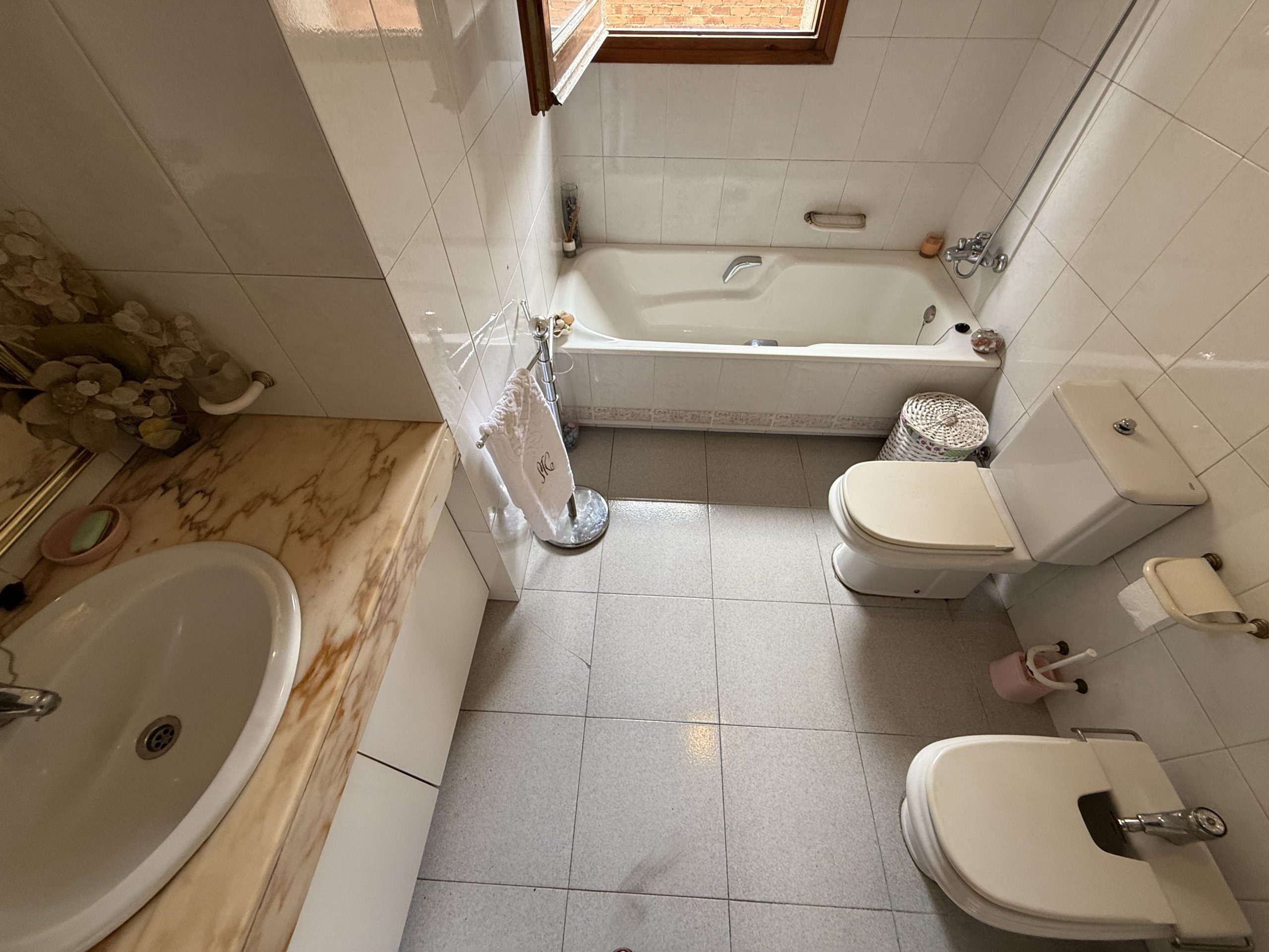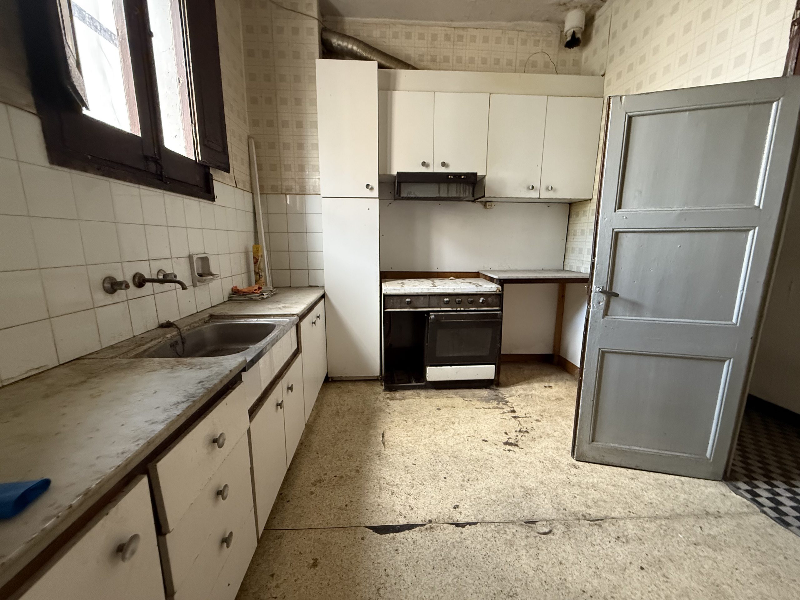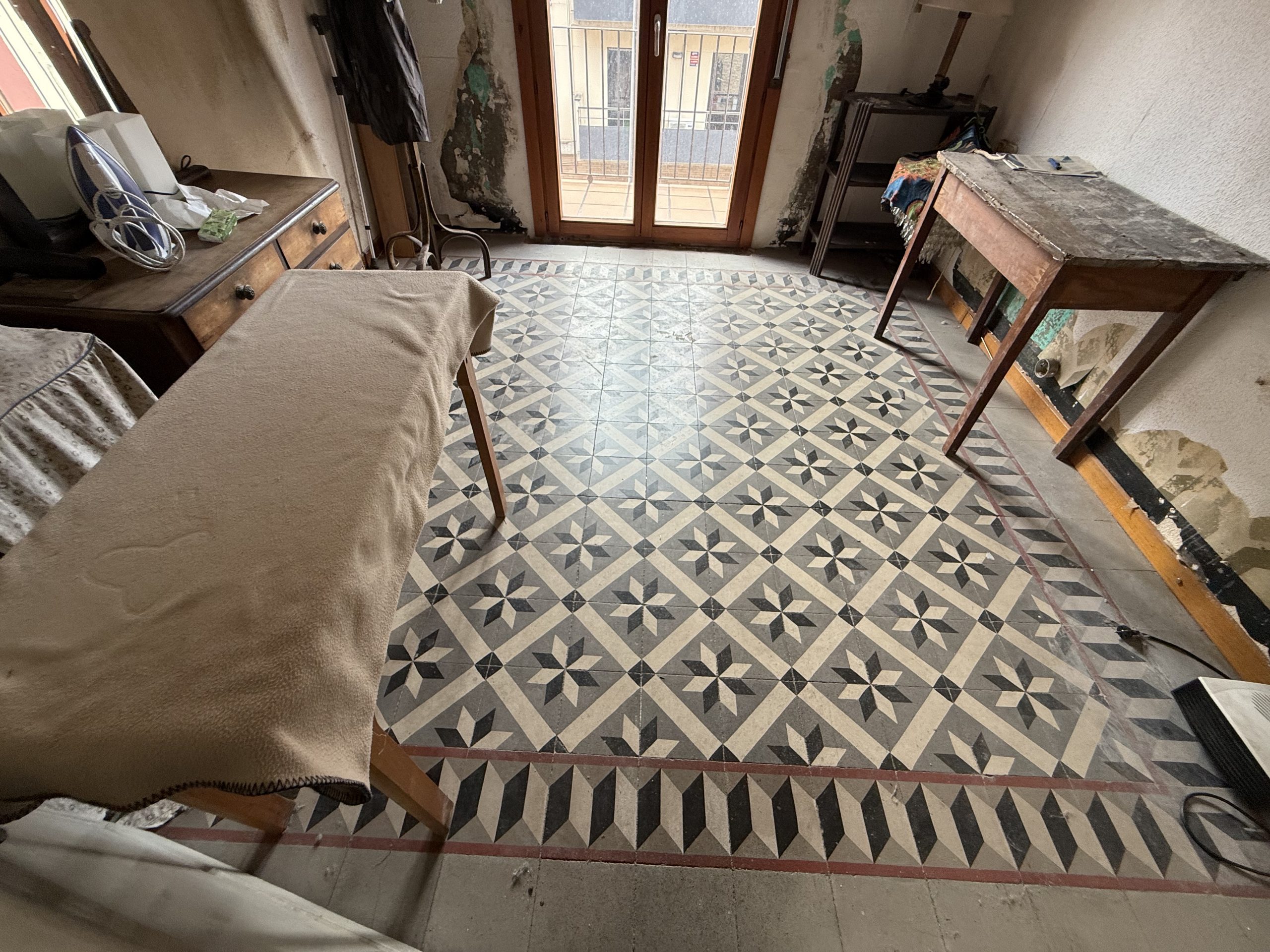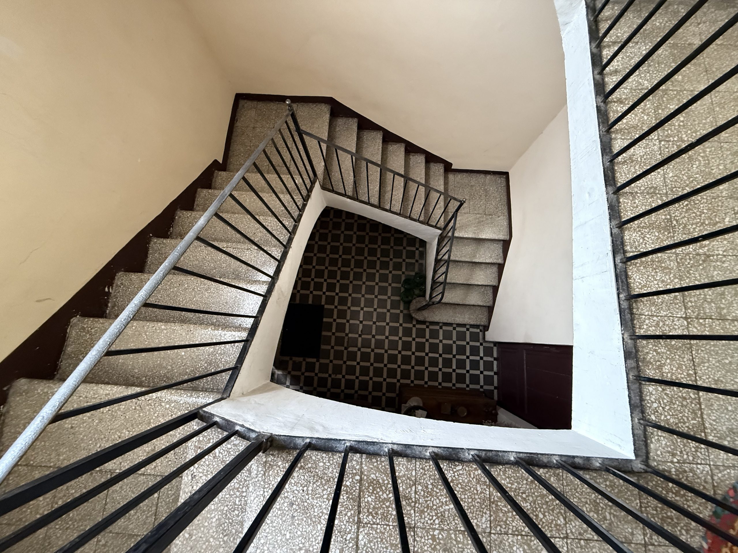 Le premier étage est un logement de 109 m² prêt à habiter, avec cuisine équipée, trois chambres doubles, une salle de bain complète avec baignoire, buanderie, un grand salon-salle à manger et un balcon de 12 m².
